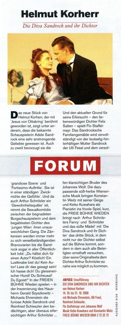 Das neue Stück von Helmut Korherr zeigt nicht nur die Diva selbst und ihre Mutter, nicht nur die beiden Dichter Felix Salten und Arthur Schnitzler, sondern vor allem, dass die Sandrock eine überaus kapriziöse Geliebte ist. Auch zu zweit bevorzugt sie die 'grandiose Szene' und Fortissimo-Auftritte'. Sie ist in einer ständigen Zwickmühle der Gefühle. Und da auch Schnitzler ein 'Gewohnheitsquäler ' ist, nimmt die erotische Geschichte zwischen der berühmten Burgschauspielerin und dem begabtesten Dichter des 'jungen Wien' seinen unausweichlichen Gang, und die Zänkereien werden immer mehr zu sich verselbständigenden Bravourarien. Bis die Sandrock schreit: „Du hältst dich für einen Autor! Köstlich! Ein Lustknabe bist du! Kein Autor! Laß dir das gesagt sein! Ich hasse dich! Du gleißnerischer Hund! Du Scheusal! Du - Egoist!"