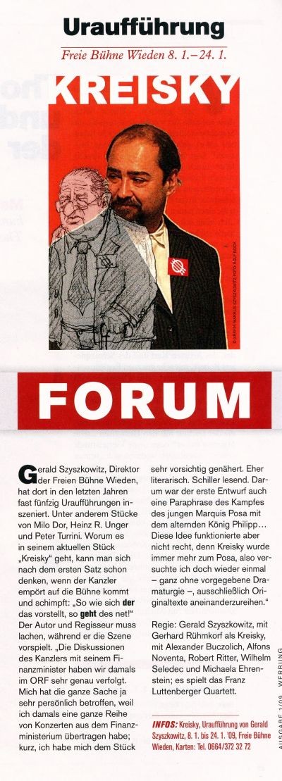 Die nächste Annäherung versuchte ich über die Dramaturgie des Intrigantenstückes .Professor Bernhard!' von Schnitzler. Diese Dramaturgie hatte ich schon einmal für meinen .Direktor Mahler' verwendet. Aber auch in diesem Entwurf emanzipierten sich die Figuren, so dass von der ursprünglichen Dramaturgie bald nichts mehr vorhanden war. Also wurde ich endlich mutig und versuchte wieder einmal ohne die Fesseln einer vorgegebenen Dramaturgie ausschließlich Originaltexte aneinander zu reihen - nur die Texte der Dialogpartner musste ich erfinden - die ich vor allem in Kreiskys Memoiren, im Androsch-Buch von Beppo Mauhart und im Kreisky-Buch von Elisabeth Horvath gefunden hatte ...