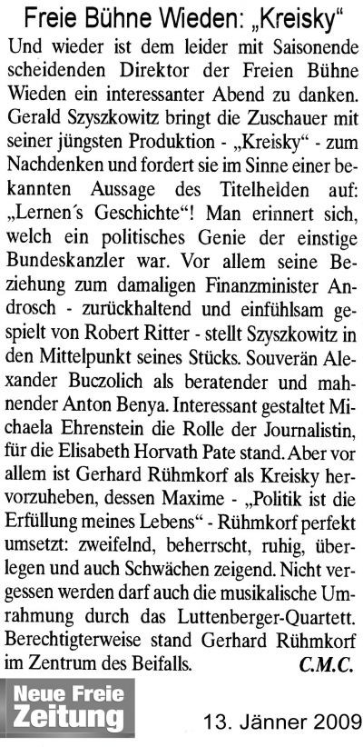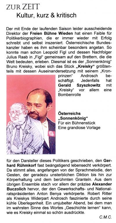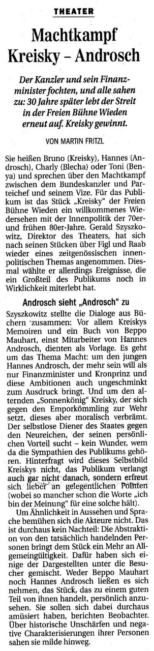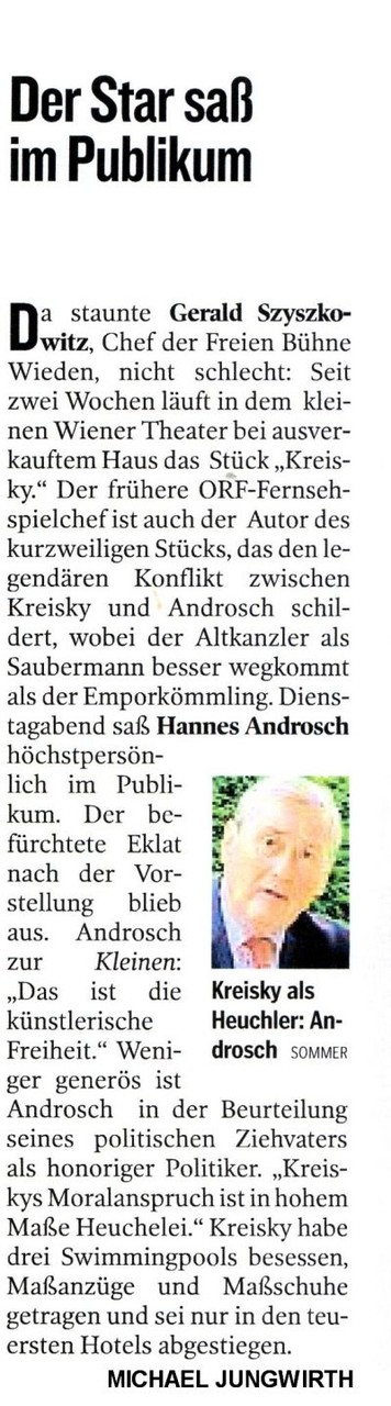 Das Kreisky-Stück ist ein Sonderfall unter meinen "historischen Stücken". Denn dem Kanzler Figl und all den anderen von Schubert bis Schiele bin ich persönlich ja nie begegnet, aber Kreisky doch. Und das hat mich beim Schreiben eine Zeit lang behindert. Ich bin Kreisky zwar nur kurz begegnet - viel zu kurz, um daraus einen Bühnendialog zu machen -, aber seinen Streit mit Androsch haben wir doch sehr ausführlich nicht nur auf dem ORF-Bildschirm verfolgt, sondern er wurde auch monatelang bei allen ORF-Hauptabteilungsleiter-Sitzungen heftig diskutiert.