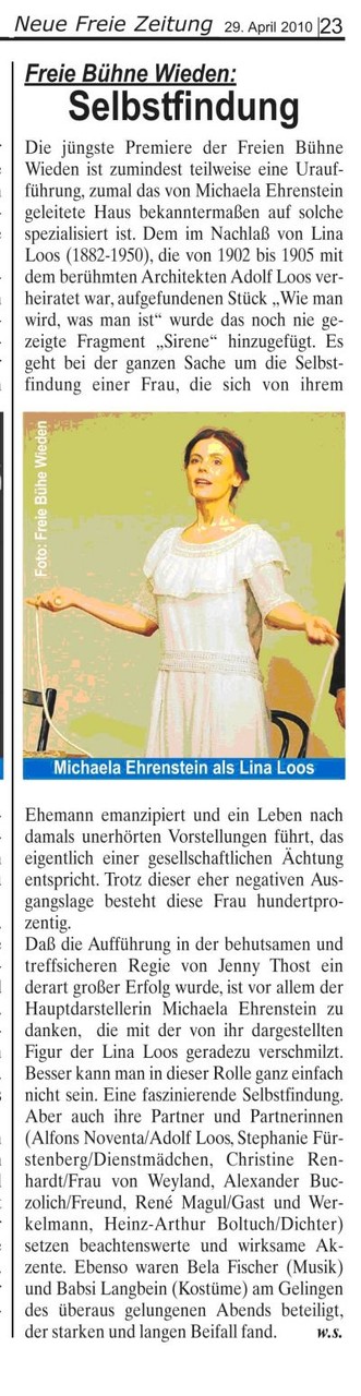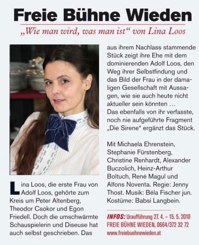 Das Stück stammt aus dem Nachlass der Künstlerin und schildert autobiographisch gestützt den Weg einer Selbstfindung. Die erste Frau von Adolf Loos gehörte zum Kreis um Peter Altenberg, Egon Friedell und Theodor Czokor. Bald löste sich die umschwärmte Schauspielerin und Diseuse aus ihrer Ehe mit dem dominierenden Adolf Loos und fand zu immer größerer Eigenständigkeit. Das ebenfalls von Lina Loos verfasste Fragment „Die Sirene“ setzt die Tradition unserer Uraufführungen fort und ergänzt die Aufführung, die musikalisch einfühlsam von Béla Fischer, jun. betreut wird.