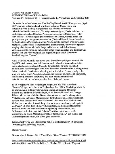 Während sein Tractatus zum Auslöser neuer Denkschulen - vor allem in der Sprachwissenschaft, der Logik und der Mathematik - wird, bekämpft er selbst bis zu seinem Tod 1951 sein Jugendwerk energisch. Wittgenstein ist ein Mensch, der alles in Frage stellt: Gott, die Welt und nicht zuletzt sich selbst.