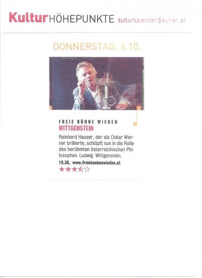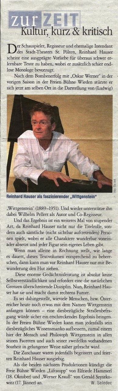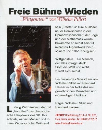 Reinhard Hauser, der vergangenen Herbst an der Freien Bühne Wieden als Oskar Werner brillierte, schlüpft nun in die Rolle des berühmten österreichischen Philosophen Ludwig Wittgenstein.