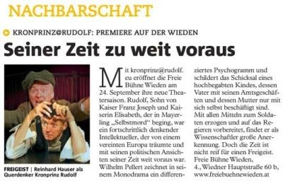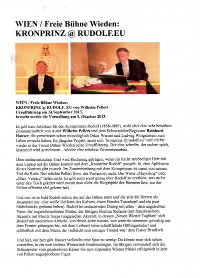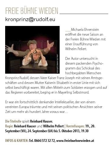 Wilhelm Pellert zeichnet in seinem Monodrama „kronprinz@rudolf.eu" ein differenziertes Psychogramm und schildert das Schicksal eines hochbegabten Kindes, dessen Vater mit seinen Amtsgeschäften und dessen Mutter nur mit sich selbst beschäftigt sind. Mit allen Mitteln zum Soldaten erzogen und auf das Regieren vorbereitet, findet Rudolf als Wissenschafter auf dem Gebiet der Vogelkunde große Anerkennung.