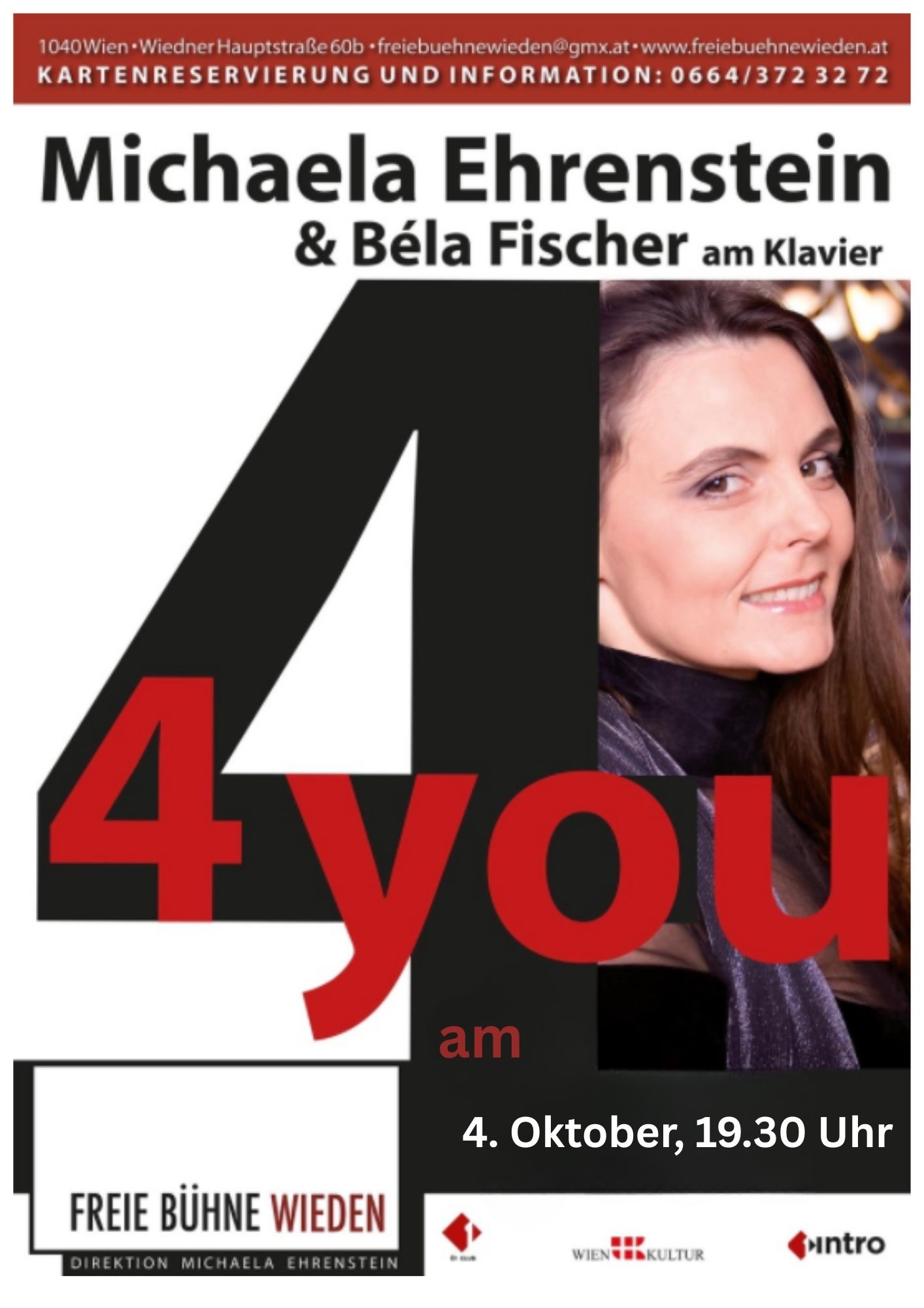 Michaela Ehrenstein erzählt Persönliches aus ihrem Leben als Theaterdirektorin, denkt über die Besetzungscouch nach und gewährt humorvolle Einblicke in ihre täglichen Herausforderungen als Theatermacherin. Zusammen mit Béla Fischer am Klavier erwarten Sie musikalische Höhepunkte von Kreisler bis Aznavour und eine Vorschau auf die Programmhöhepunkte der Freien Bühne Wieden bis Ende 2025.