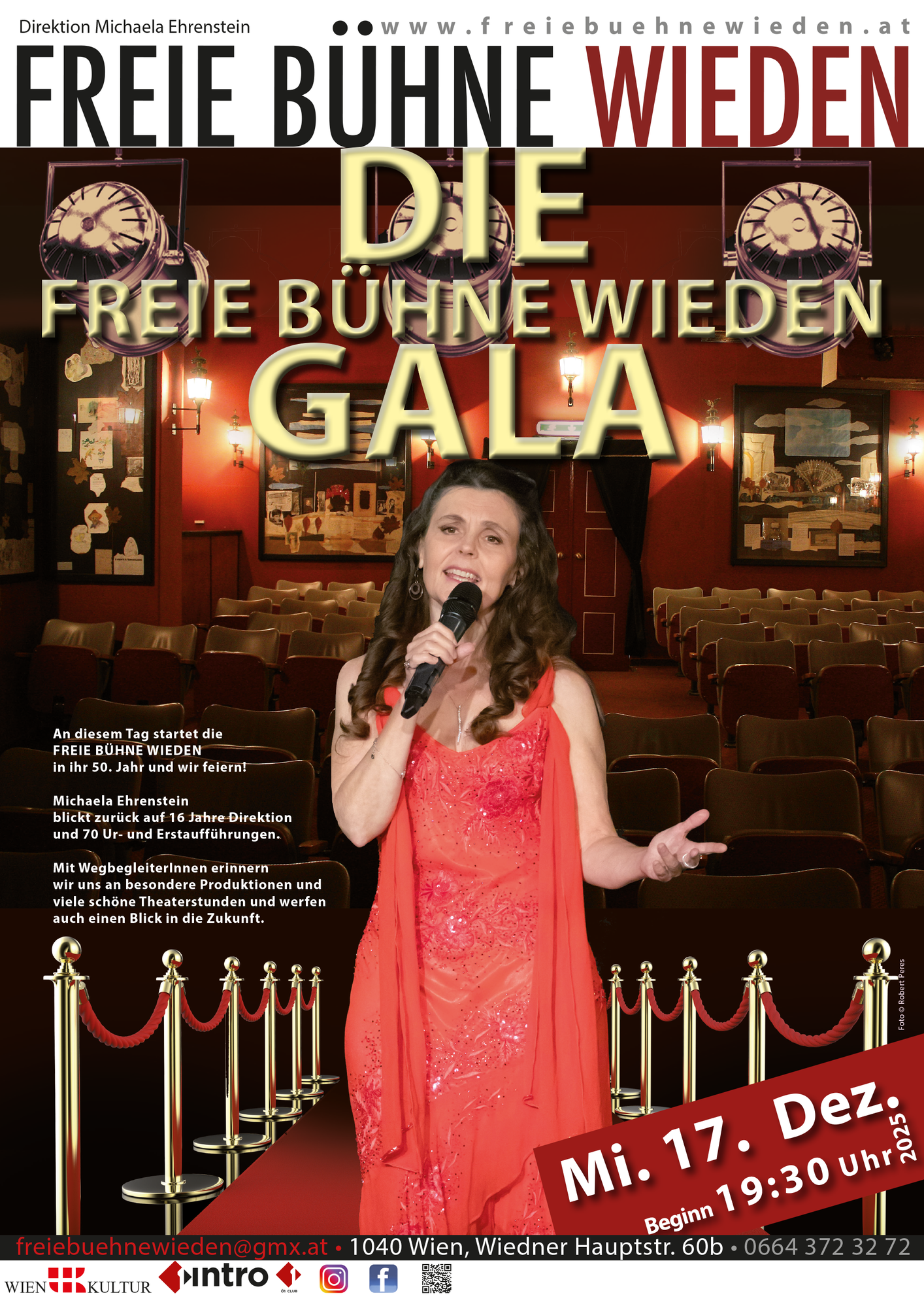 An diesem Tag startet die Freie Bühne Wieden in ihr 50. Jahr und wir feiern! Michaela Ehrensteinblickt zurück auf 16 Jahre Direktion und 70 Ur- und Erstaufführungen! Mit langjährigen WegbegleiterInnen erinnern wir uns an besondere Produktionen und viele schöne Theaterstunden. Am Ende der Veranstaltung erhält Gernot Kranner, der die Freie Bühne Wieden ab 2026 leiten wird, in einer feierlichen Übergabe die Schlüssel zur Freien Bühne Wieden