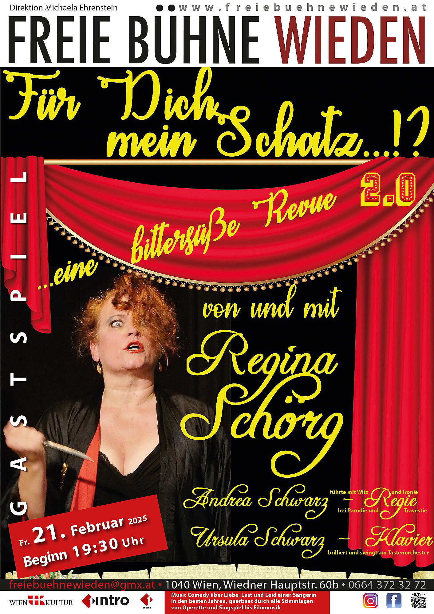 Regina Schörg schrieb, singt und spielt in ihrer Music Comedy über Liebe, Lust und Leid einer Sängerin in den besten Jahren, querbeet durch alle Stimmlagen von Operette und Singspiel bis Filmmusik.